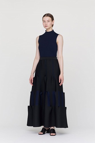 張りの強い再生ポリエステルを使用し、部分的に穴を開けながらAラインに編み立てることで、