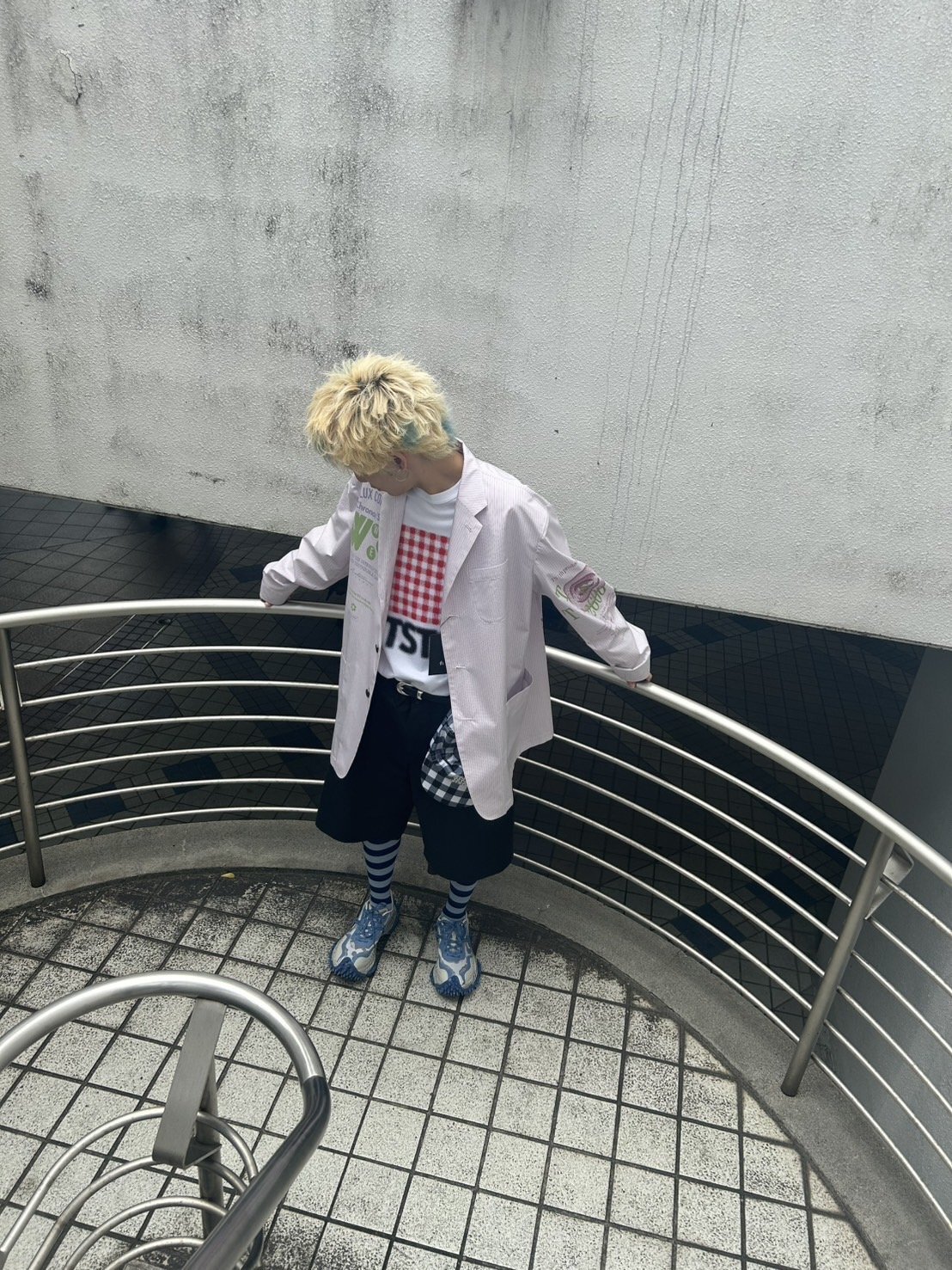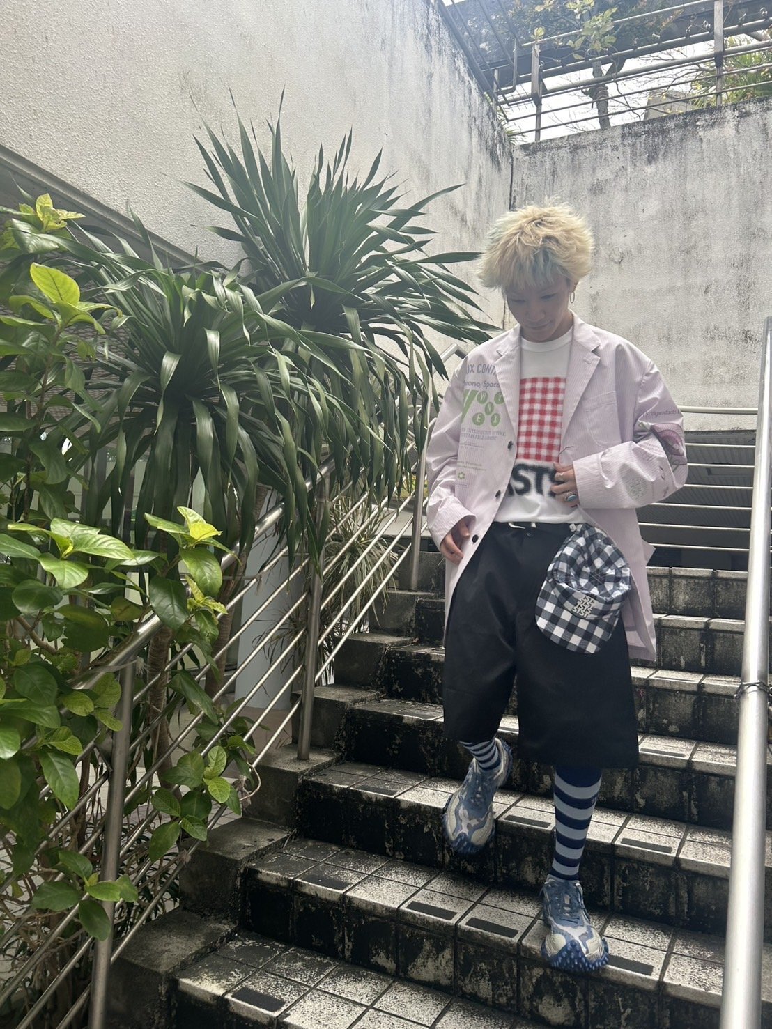 このボリュームのあるスニーカーがモード感あるスタイリングとソックスの色で上手くまとまって見えます。