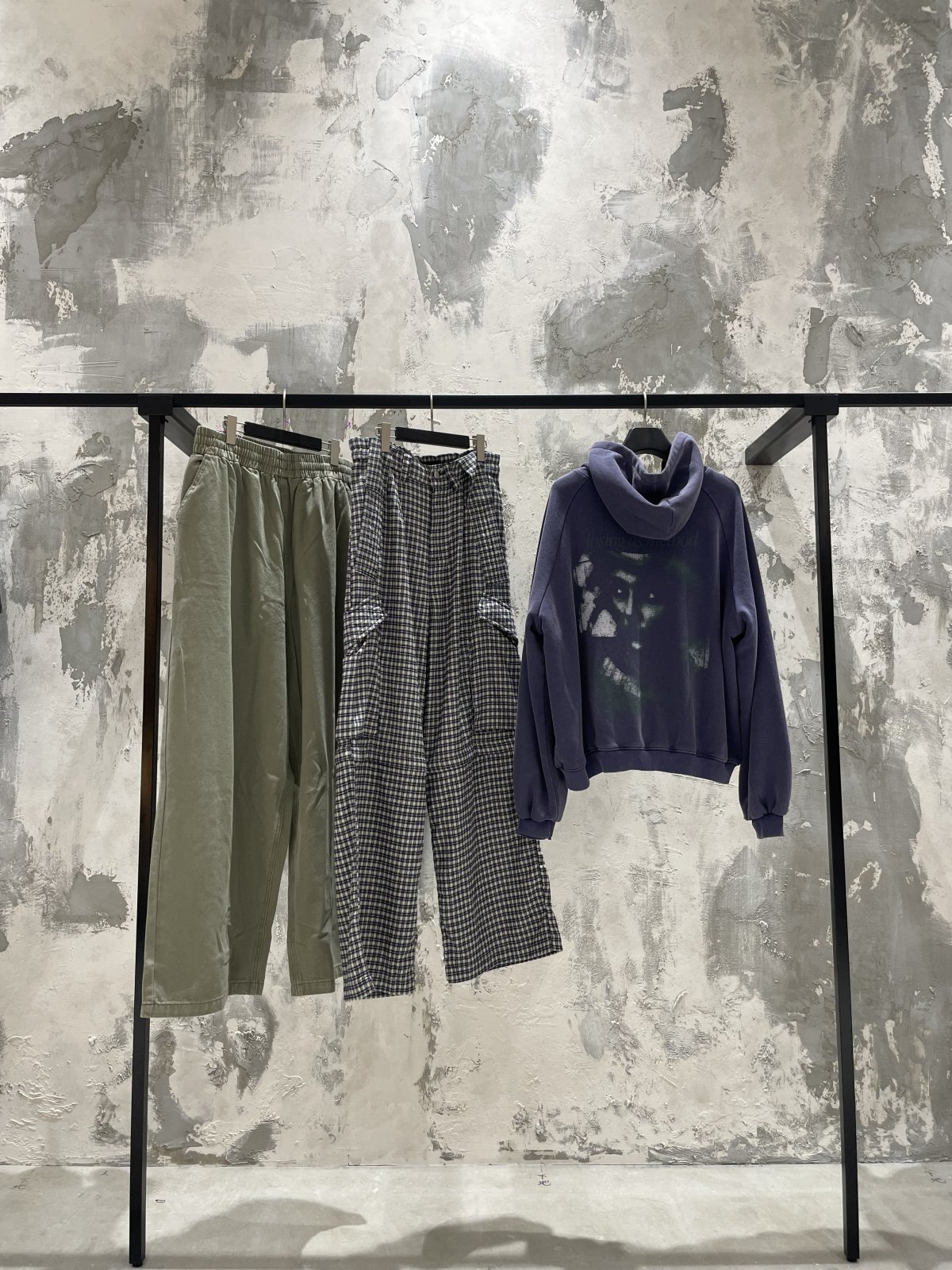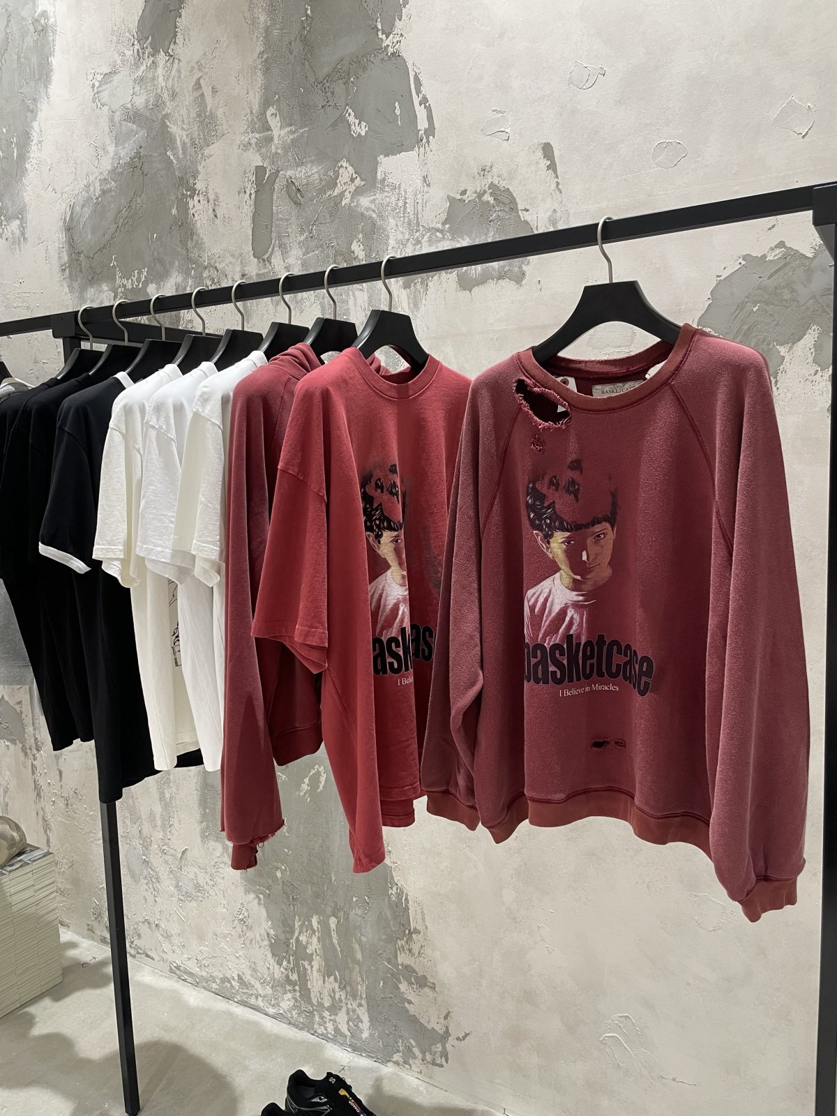 クラッシュ加工が目を引くラグランスウェットシャツはこのブランドらしい少しダークな雰囲気があります。