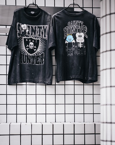 本作では、BOUNTY HUNTERを象徴するアイコン「SKULL KUN」を©SAINT Mxxxxxx仕様に再構築したアイテムに加え、「SAINTY HUNTER」のテキストなど、両者の世界観を融合したディテールを随所に採用しています。ビジュアルにはHIKARU氏を起用し、フォトグラファーRK氏が撮り下ろし。両ブランドの背景にあるカルチャーが交差する世界観を表現しています。