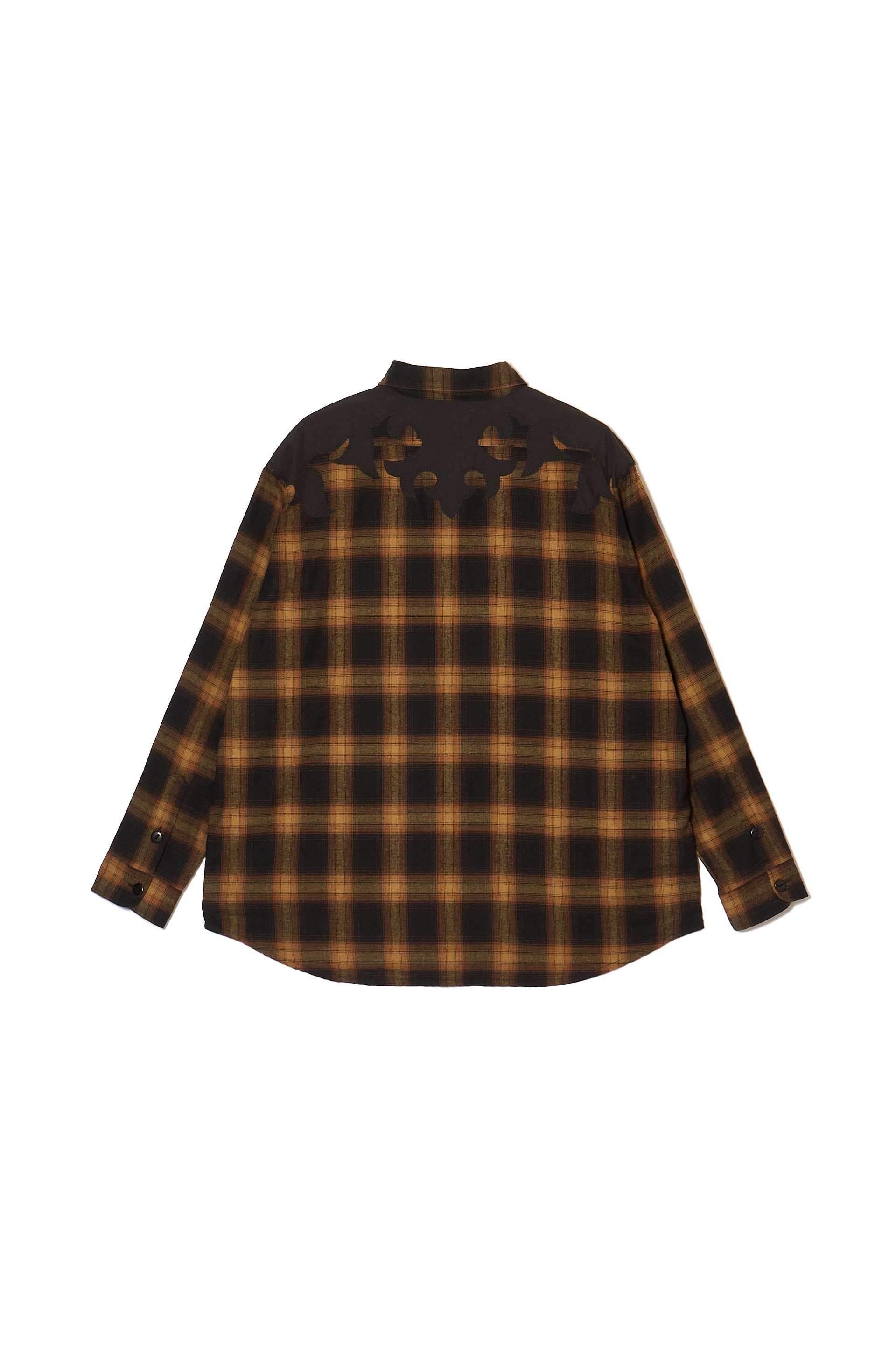 袖にスタッズ刺繍、バッグにウエスタンヨークの切り替えしデザインのオンブレチェックシャツになります。