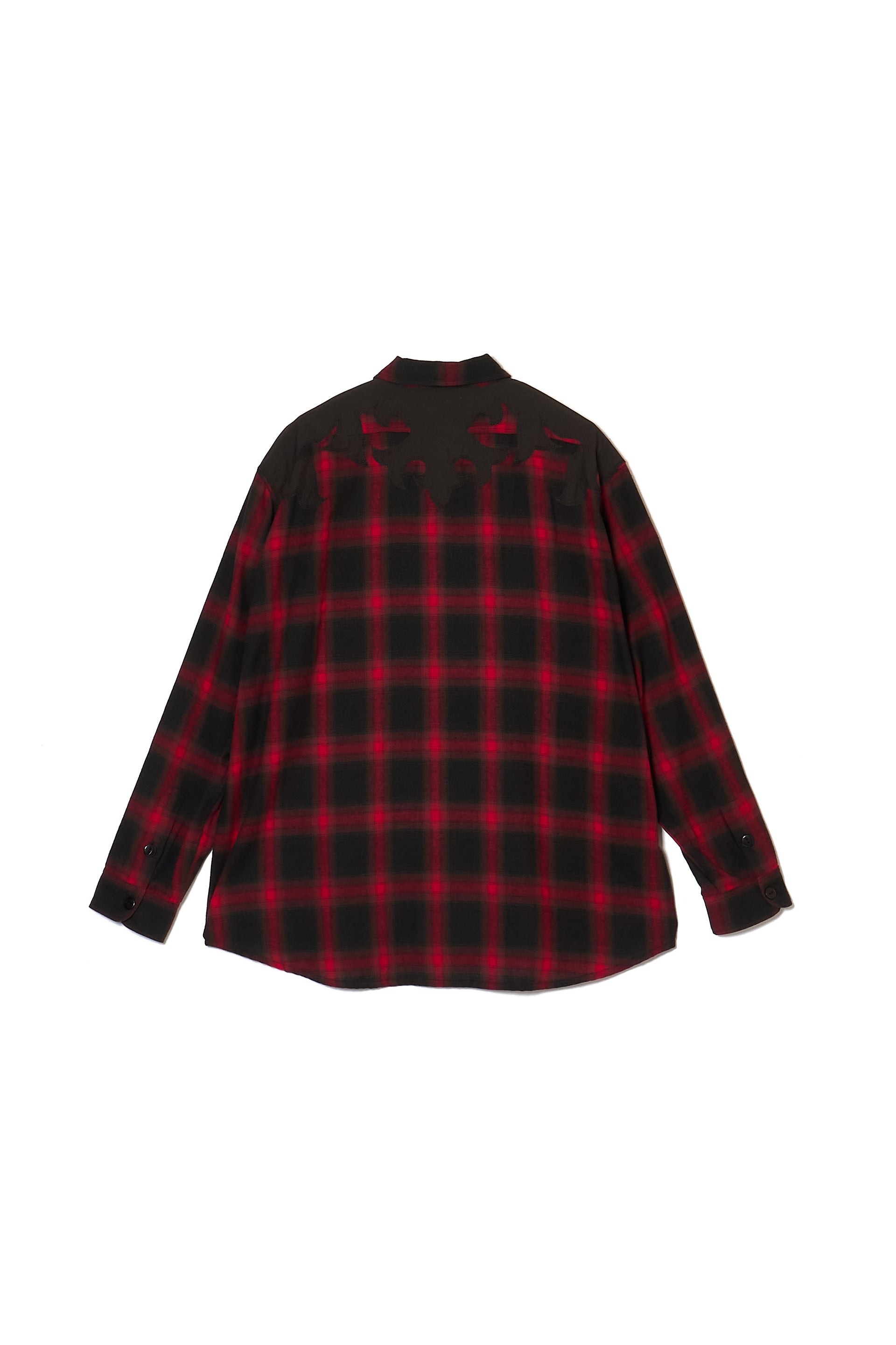 袖にスタッズ刺繍、バッグにウエスタンヨークの切り替えしデザインのオンブレチェックシャツになります。