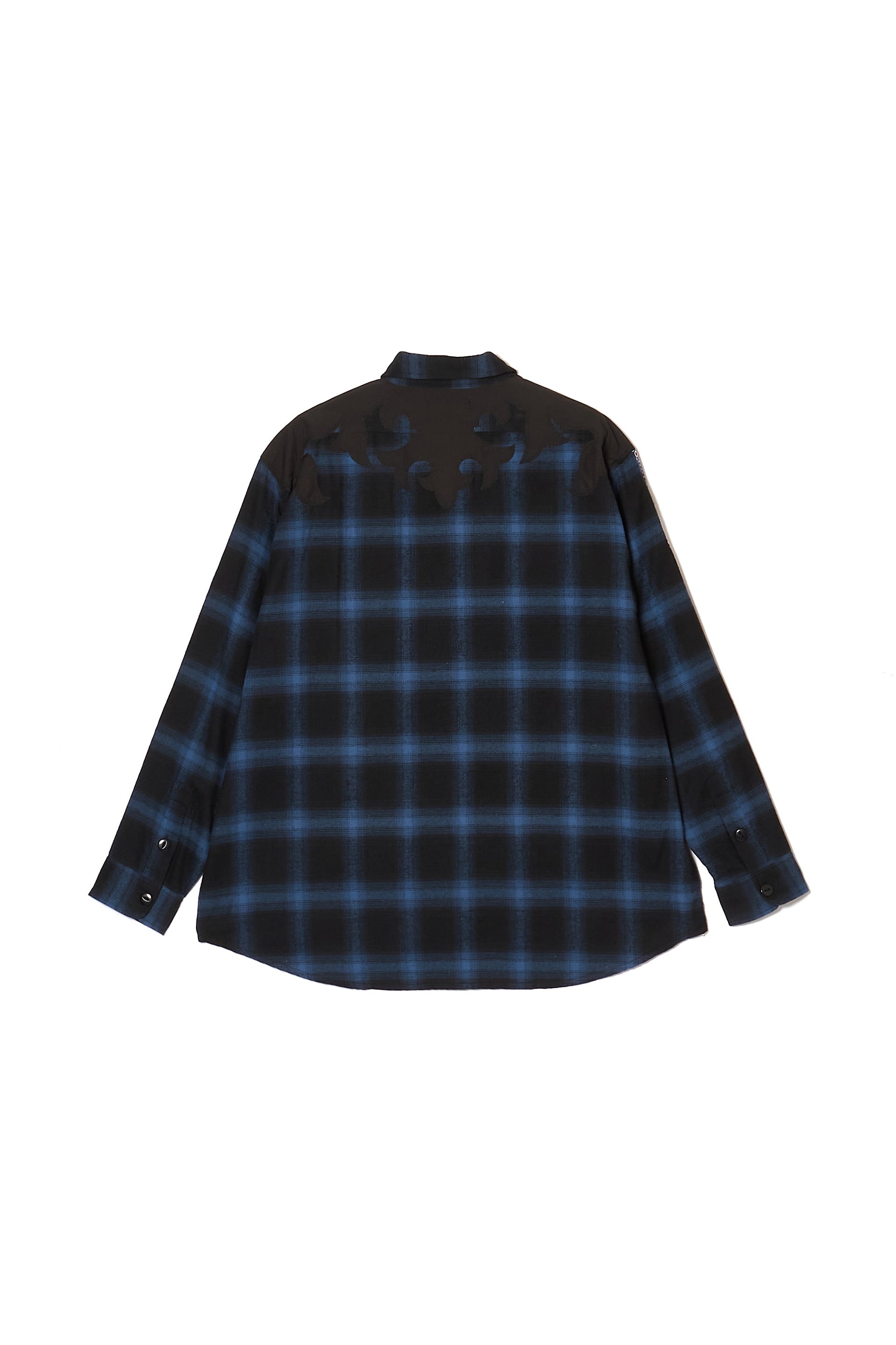 袖にスタッズ刺繍、バッグにウエスタンヨークの切り替えしデザインのオンブレチェックシャツになります。