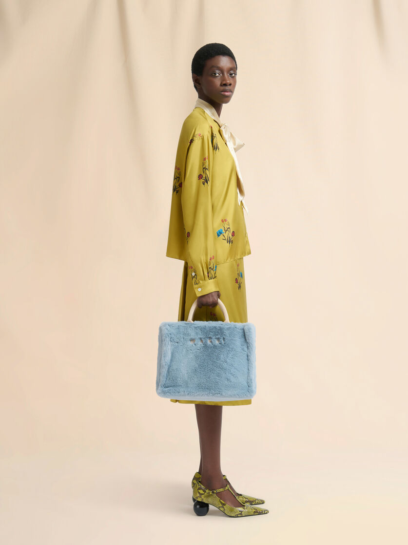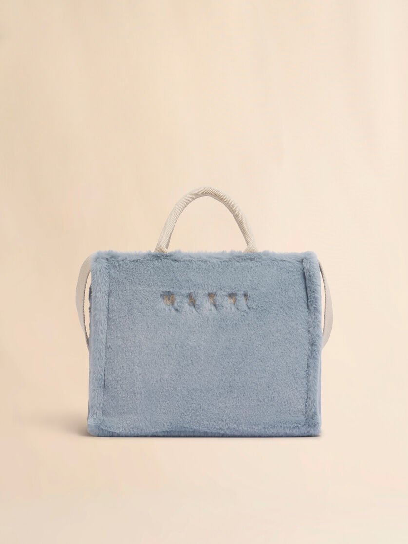 フェイクファーを使用したバスケットショッパー。 スモールサイズ。 テープ製トップハンドルとショルダーストラップ。 刺繍によるマルニロゴ入り。 コットンライニング、ジッパーポケット付き。 レザースタッズストラップ留め。