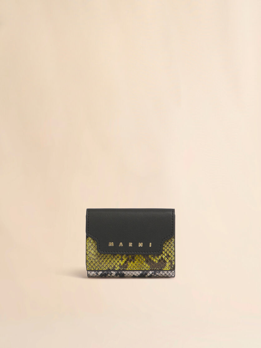 パイソンプリントのパネルをあしらったサフィアーノレザー製三つ折りウォレット。 スナップボタン留め。 外側にスナップボタン開閉式のコインポケット、フロントにゴールドプリントのマルニロゴ。 紙幣用コンパートメントとカードスロット6つ。