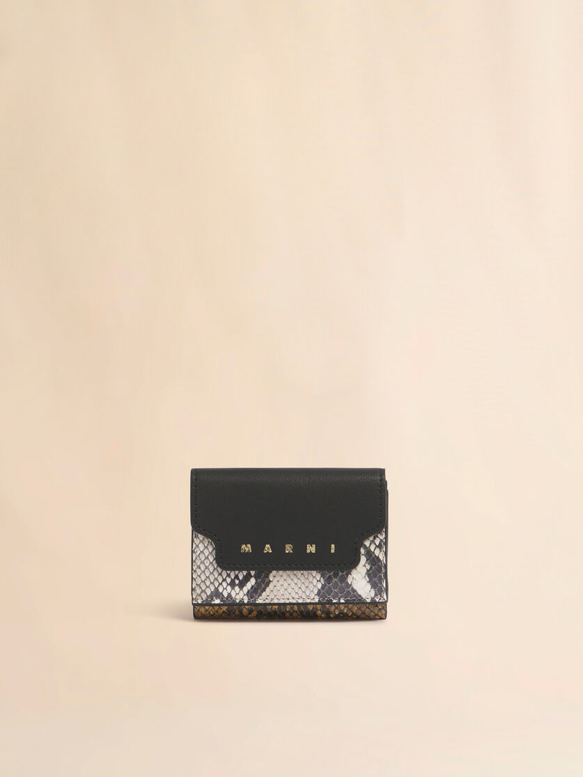 パイソンプリントのパネルをあしらったサフィアーノレザー製三つ折りウォレット。 スナップボタン留め。 外側にスナップボタン開閉式のコインポケット、フロントにゴールドプリントのマルニロゴ。 紙幣用コンパートメントとカードスロット6つ。