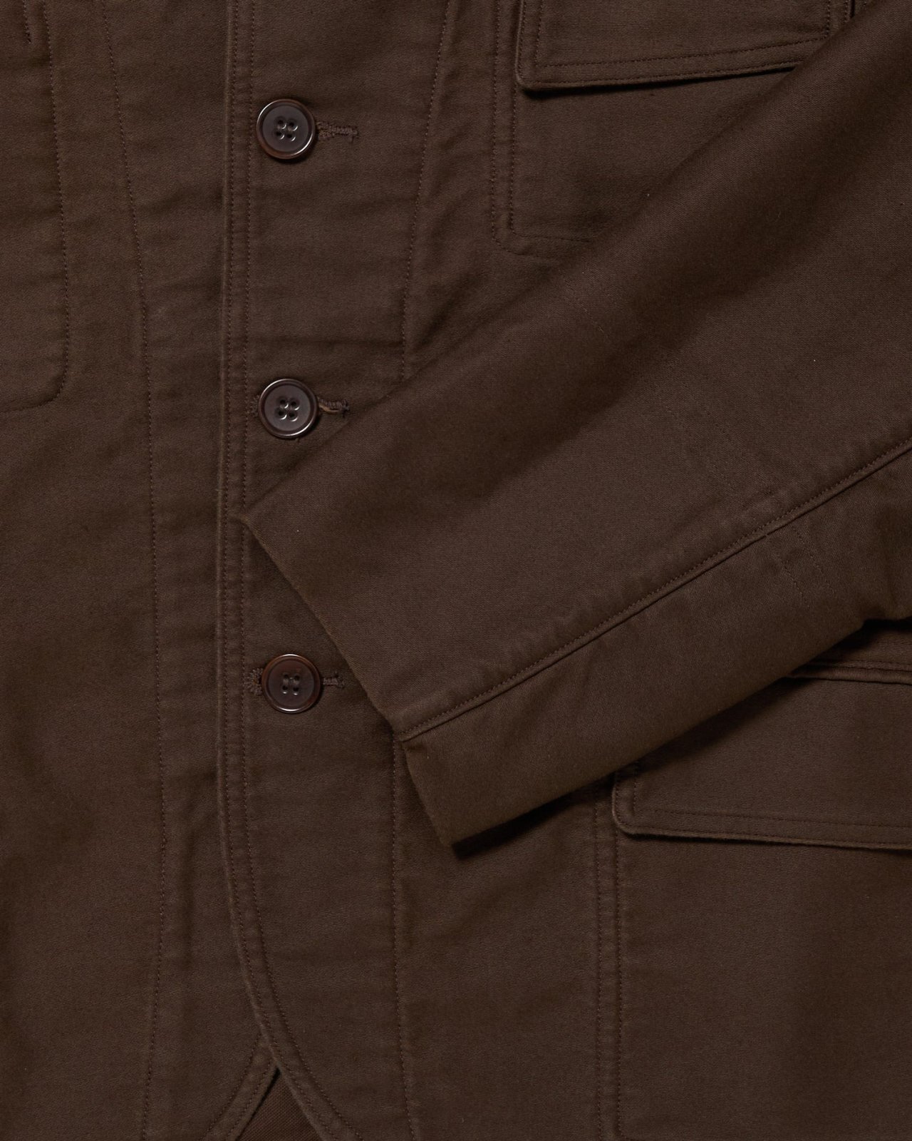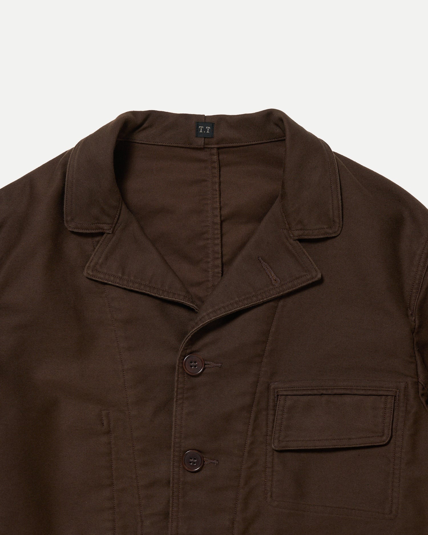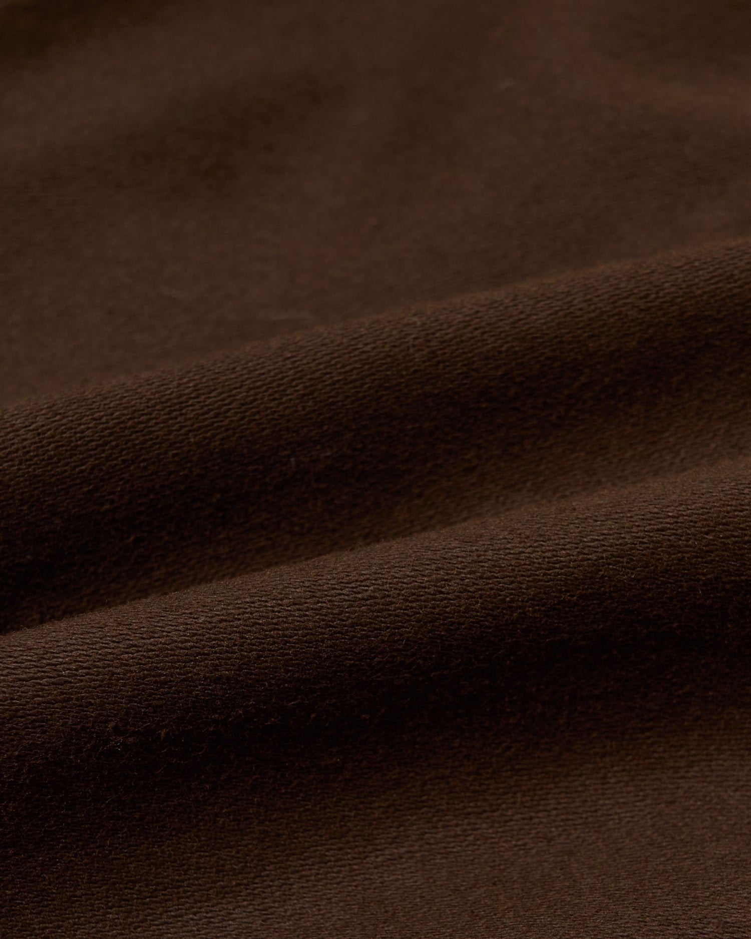ミリタリーモールスキンは、上品な光沢と、まるでモグラの皮のような表面の微起毛が特徴の厚手の生地です。耐久性に優れ、1800年代から1950年代にかけてフランスの炭鉱労働者が着用していたワークジャケットの生地として人気を博しました。ヴィンテージ特有のドライな風合いと起毛感を再現するため、あえて太番手の糸を使用。シルケット加工を施すことで、上品な光沢と無骨な風合いを両立しています。