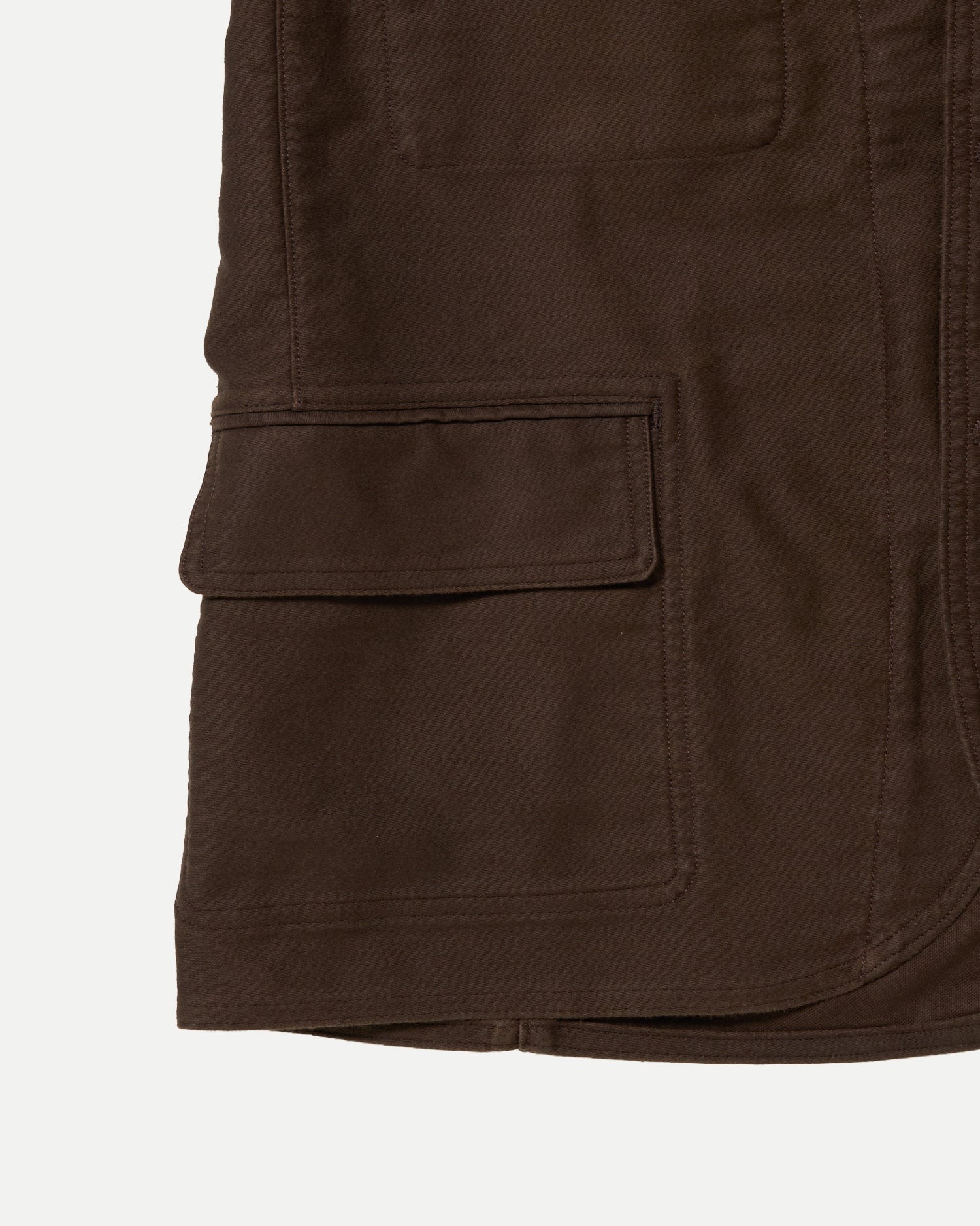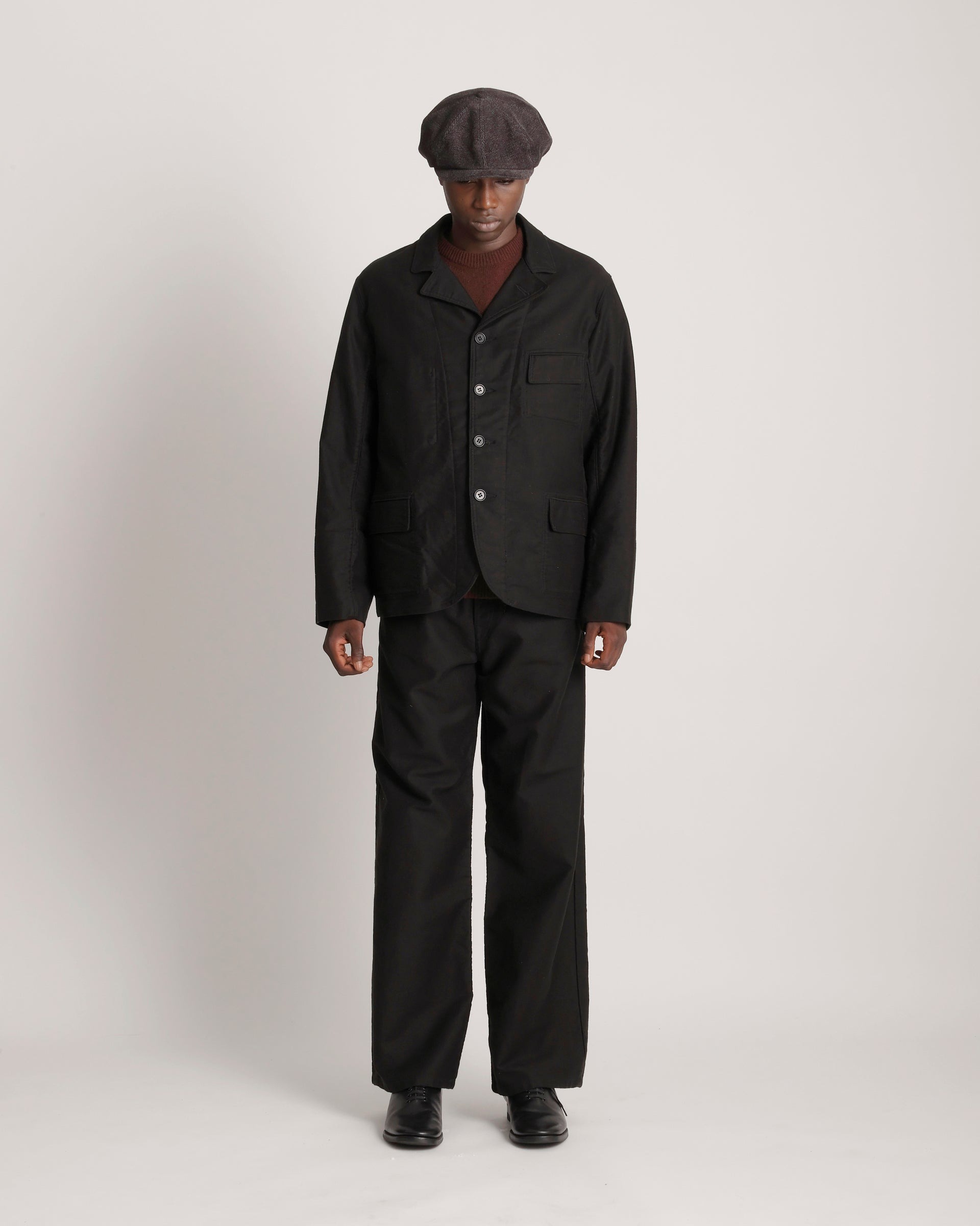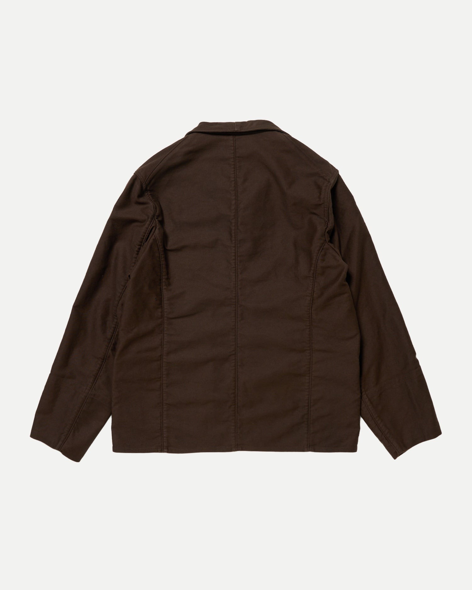 ミリタリーモールスキンは、上品な光沢と、まるでモグラの皮のような表面の微起毛が特徴の厚手の生地です。耐久性に優れ、1800年代から1950年代にかけてフランスの炭鉱労働者が着用していたワークジャケットの生地として人気を博しました。ヴィンテージ特有のドライな風合いと起毛感を再現するため、あえて太番手の糸を使用。シルケット加工を施すことで、上品な光沢と無骨な風合いを両立しています。