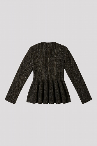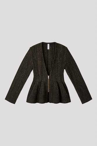 深めのVネックが特徴のカラーレスジップジャケット。立体感のあるストライプの編み地は、見る角度によって異なる表情を見せます。セミフィットのボディに、ウエストから広がる構築的なフレアが美しいシルエットを描き、華やかな雰囲気を演出します。
