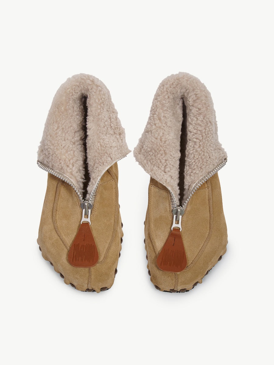 ジッパー要素とロゴ プラーを備えたシアリング ブーツ。