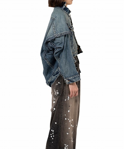 前後でシルエットに差をつけた、前後非対称デザインのデニムジャケット。