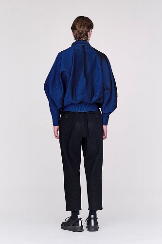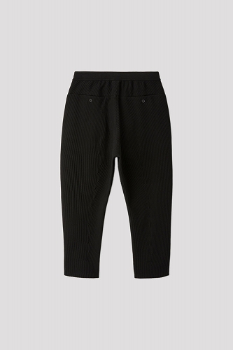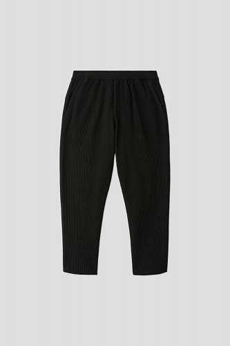 程よいボリュームが特徴のテーパードパンツ。立体感のあるストライプの編み地は見る角度によって異なる印象を与えます。