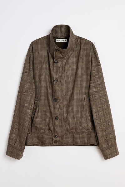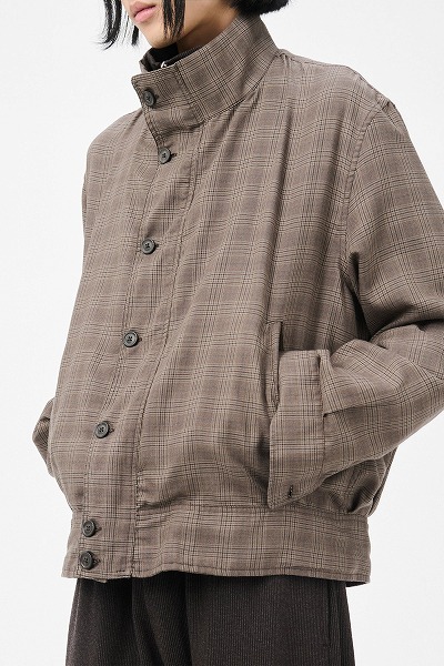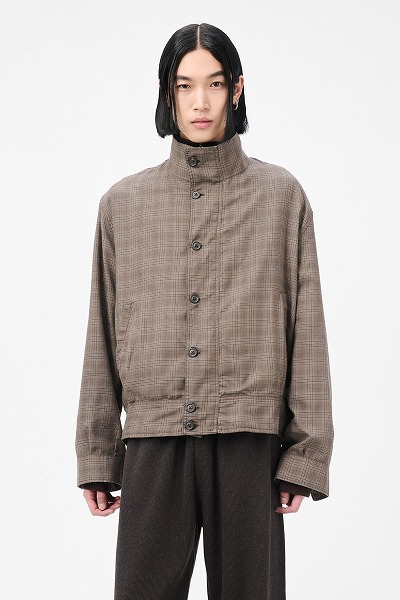 ダーティブラウンのグレンチェック柄モックボンバー。日本製のポリエステルとレーヨンの混紡生地を使用したメンズモックボンバーは、リラックスフィットで、ファネルネック、プリーツ入りのウエストバンドと袖口、ホーンボタンが特徴です。ボンバージャケットからインスピレーションを得たこのデザインは、袖口、襟、ウエストバンドに伝統的なニットリブを使用せず、代わりに複数のプリーツを施すことで、全体に柔らかな流れ、ボリューム、ドレープを生み出しています