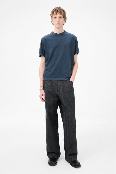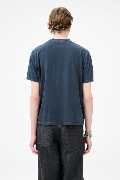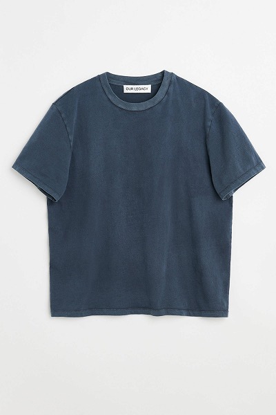 ウォーンブルーのレガシージャージーを使用したボックスTシャツ。ポルトガル産コットンジャージーを使用したメンズボックスTシャツは、ゆったりとしたボックスフィットで、リブカラーとストレートヘムが特徴です。
