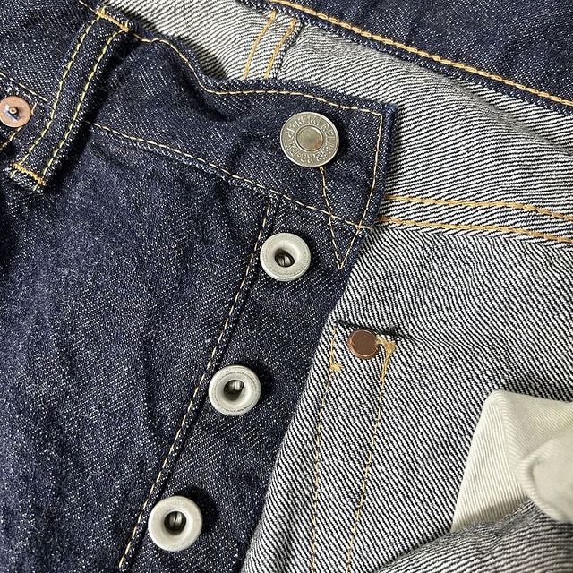 クラシックなディテールを重視し、ボタンには鉄素材を使用。時間の経過と共に錆が発生し、使い込むほどにヴィンテージらしい風合いが深まります。ボタンフライや伝統的な縫製仕様など、当時のデザインを細部まで忠実に再現しました。