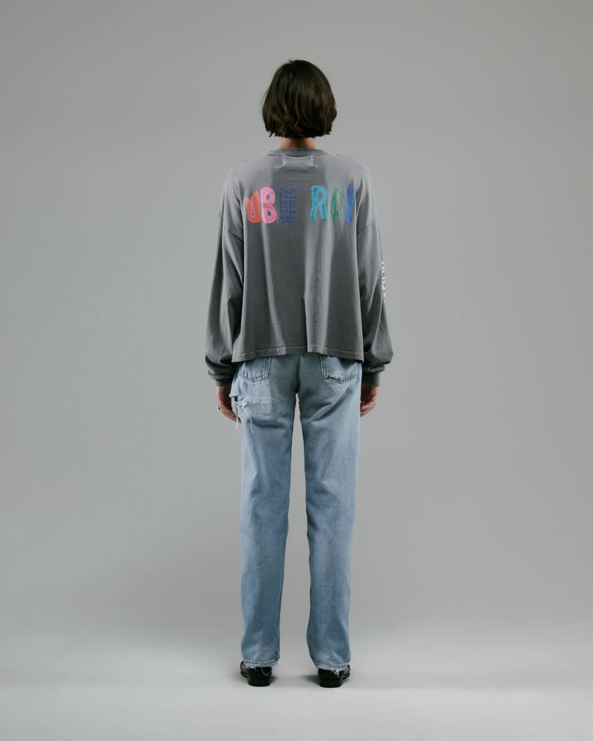 フロント、バック、袖に本物のダメージ加工を施したプリントグラフィック