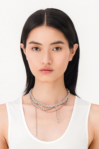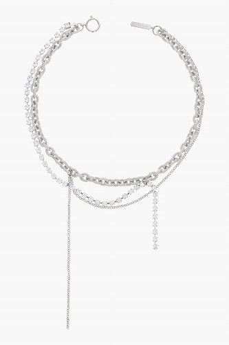 テクスチャードチェーン、クリスタルチェーン、そしてスモールリンクチェーンを組み合わせたシルバートーンのネックレス。