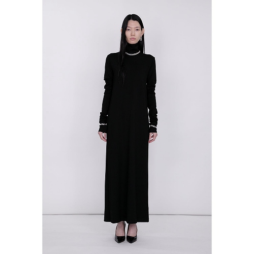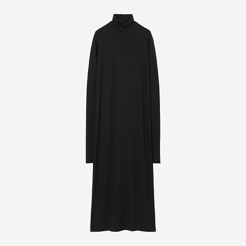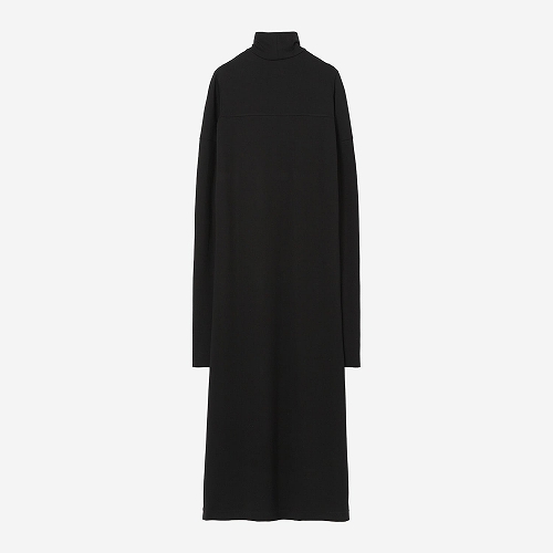 レーヨンを入れることで、今までにない落ち感のあるダンボールニットを実現しました。適度に厚みのある質感で肌触りが非常によく、通年着用いただける素材です。ロングスリーブのカットソーをレイヤードしたような2トーンのロングドレス。体のラインに沿ったミニマルなデザインとなっています。