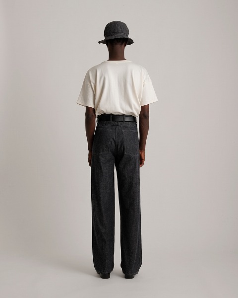 生地は、当時のヴィンテージデニムを解析し、新たに開発したオリジナル9オンスデニム。高橋大河氏自らが考案したグリーンキャストインディゴ染めのタテ糸と、染色を施さずナチュラルな色合いのヨコ糸を組み合わせ、ヴィンテージの色調を保ちながらも、糸番手と密度を緻密に調整することで、一般的な左綾デニムとは異なる、1/2右綾の深みのある風合いを実現しました。