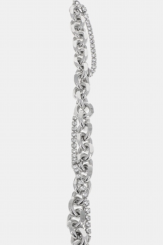 シルバートーンのダブルレイヤーチェーンネックレス。細めのクリスタルチェーンと太めのシルバートーンカーブチェーンを組み合わせたデザイン。