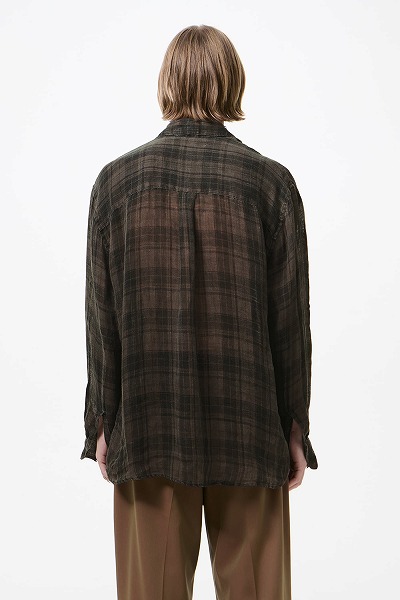 ペナンブラチェックのシアコートリネンを使用したアバブシャツ。イタリア産リネンを使用し、ペナンブラチェックの生地を使用しています。この生地は顔料コーティングとウォッシュ加工が施されており、柔らかな色合いと独特の手触りで、着古したような風合いに仕上がっています。この加工により、一枚一枚に独特の色合いと個性が生まれます。メンズのアバブシャツは、ややオーバーサイズのフィットで、胸ポケット1つ、マザーオブパールボタン、OL刺繍、カーブした裾、マイターカフスが特徴です。