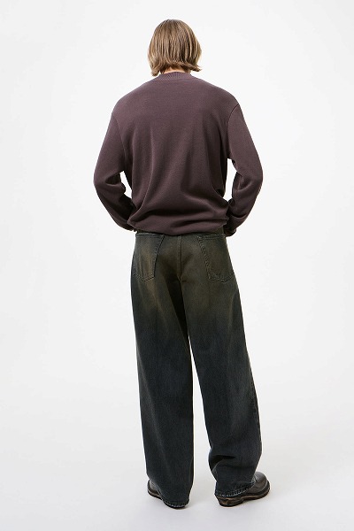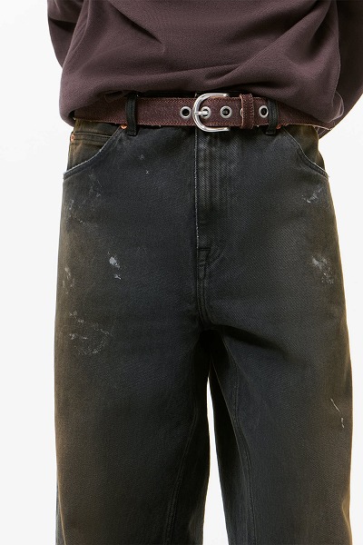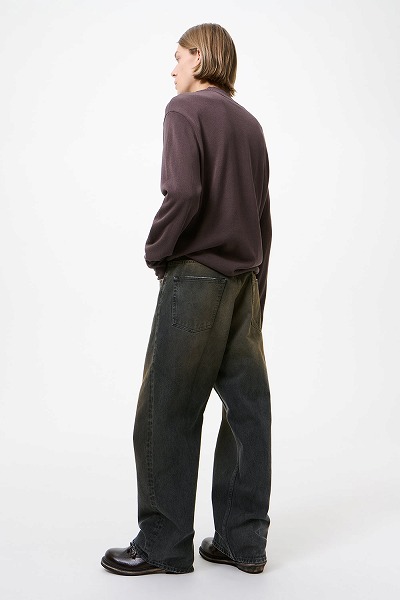ネビュラウォッシュのヴァストカット。ヴィンテージアイテムを彷彿とさせるピグメントオーバーダイ加工を施したイタリア製コットンデニムを使用し、深みのあるレイヤードトーンと、さりげない使い込んだ風合いが魅力です。ヴァストカットは、ハイウエストのゆったりとしたワイドシルエットで、5つのポケット、スチールリベット、エンボス加工の「OUR LEGACY」パッチ、YKKジップフライが特徴です。