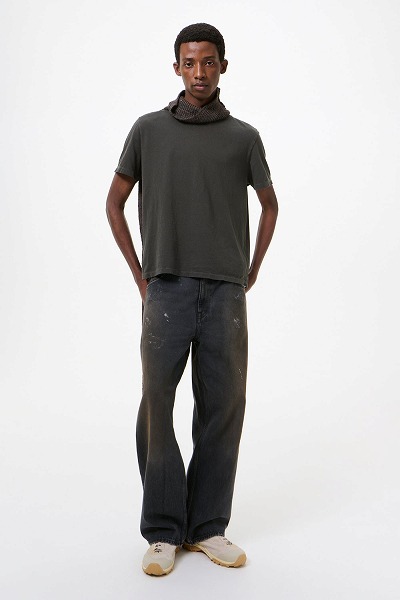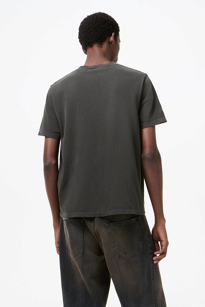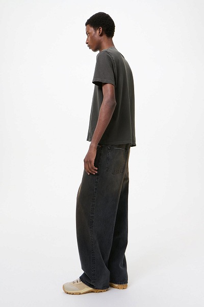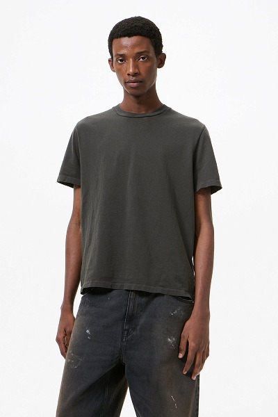 ウォーングラファイトレガシージャージーを使用したボックスTシャツ。ポルトガル産コットンジャージーを使用し、顔料染めによるフェードアウト加工を施したボックスTシャツは、ゆったりとしたボックスフィットで、リブカラーとストレートヘムが特徴。柔らかな手触りと、繊細なカラーバリエーションで着古したような風合いを演出します。
