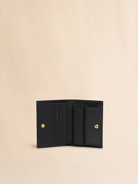 モノクロームのサフィアーノレザー製ウォレット。スナップボタン式のコインポケット、二つ折りタイプ。紙幣コンパートメント、4カードスロット。ゴールドトーンのメタルパーツ。フロントにゴールドのプリントロゴ。