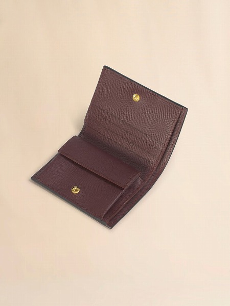 サフィアーノレザー製スナップボタン付き二つ折りウォレット。 カラーブロックデザイン。 内側にスナップ留めコインポケット、紙幣用コンパートメント、カードスロット4つ。 ゴールドトーンのメタルパーツ。 フロントにゴールドのプリントロゴ。