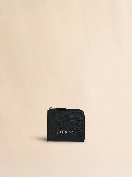 MARNI ブラック レザー製ラウンドファスナーウォレット、マルニメンディング刺繍入り [marni506]