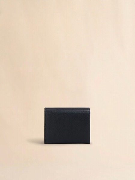 サフィアーノレザー製三つ折り財布。スナップボタン留めのモノクロームデザイン。外側にスナップボタン付きコインポケット。内側にフラットポケット1つとカードスロット1つ。ゴールドトーンの金具。フロントにゴールドで刻印されたロゴ。
