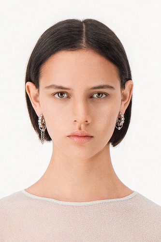 でチャンキーなフープピアスを左右で2つずつ、クリスタルのアクセントで飾ったデザイン。片方のクリスタルピアスからは、細いリンクチェーンにリングビーズがぶら下がっています。
