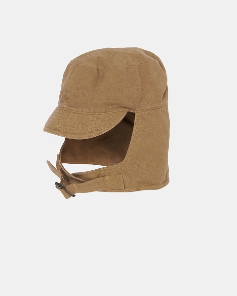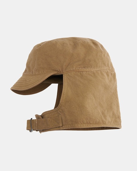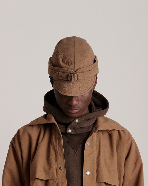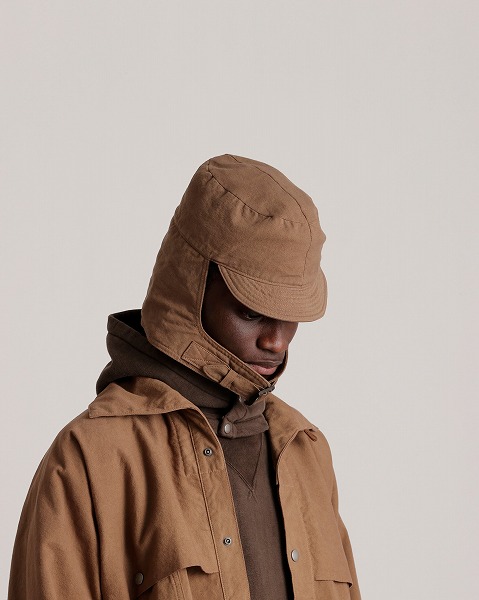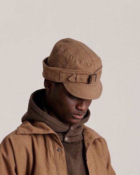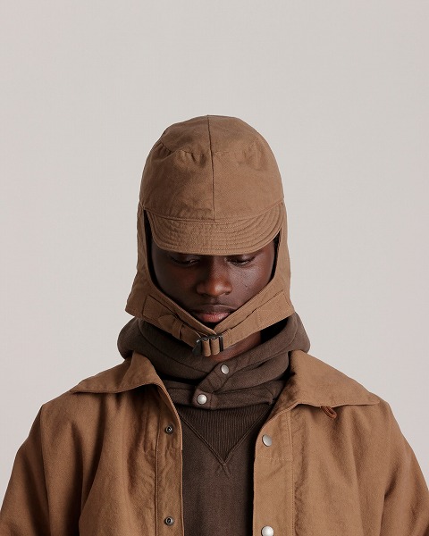 このキャップは、CCC(民間保全部隊)隊員が主に冬季に着用していたキャップをリデザインしたものです。風雨から守る耳当て付きのツーウェイ構造はそのままに、シルエットはより被りやすく調整されています。