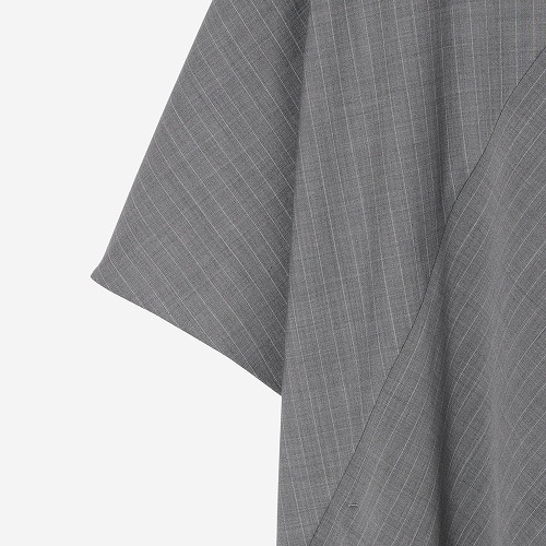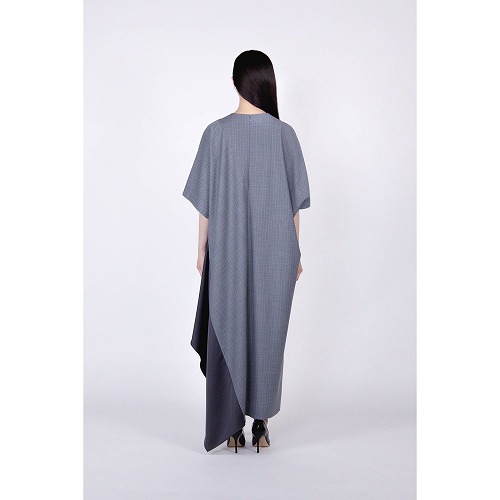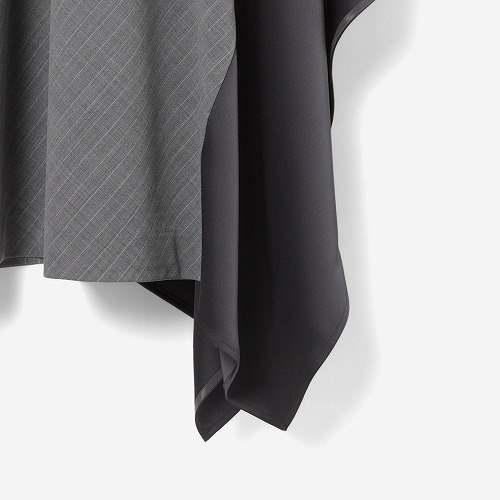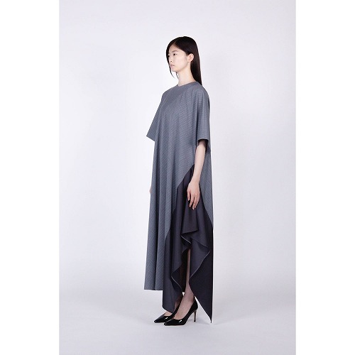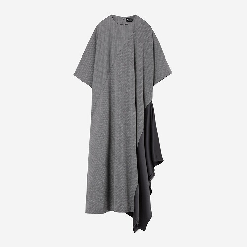アシンメトリーなデザインが特徴的なバイカラードレス。オーストラリア産ファインメリノウールとリサイクルポリエステルを使用したウールトロピカルを使用。接触冷感による着心地の良さ、防シワ性能も持ち合わせており、しなやかさと程よい膨らみ感のある風合いに仕上げた2WAYストレッチ素材です。体のラインを拾い過ぎないリラックス感がありながら、モード洗練されたデザインとなっています。