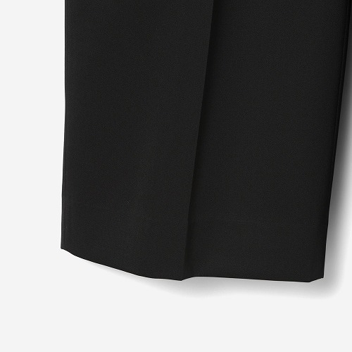 高い形状保持性とハリコシ、ナチュラルな表面感を独自の加工により再現。更に細番手の糸を使用し、メンズ規格で打ち込みの良いギャバジンを製織しました。オフスケール加工(糸表面の鱗状のような物を削ぎ落とす事で、染料が糸へ濃く入り、黒濃度を高めています)や含浸加工(樹脂のような液に漬けて紙のようなハリ感のある風合いを出しています)など特殊な加工工程を経て、ハードな硬い風合いに仕上げた素材です。ウエストからヒップにかけてのシルエットが特徴的なワイドシルエットの2タックパンツ。同素材のアウターやシャツとのセットアップでコーディネートが可能。