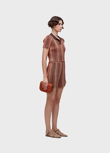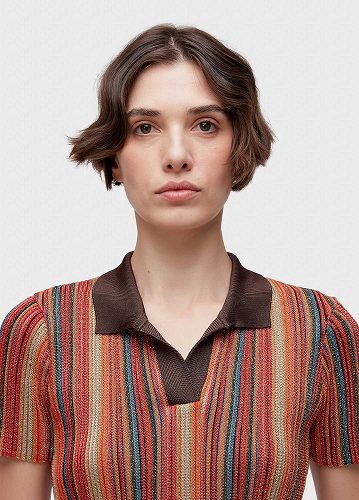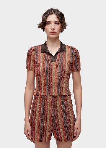 マルチカラーのリブストライプとルレックス糸を使用したニットポロブラウス。