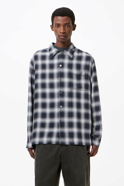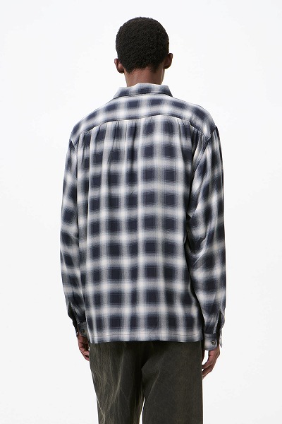 当社の定番シャツ、リノ・カウボーイ・ビスコース。チェック柄の日本製ビスコース生地を使用したこのシャツは、ゆったりとした着心地で、ストレートヘム、幅広の裏地が付いたすっきりとした前立て、真珠貝ボタン、そしてさりげないギャザーを寄せたバックヨークが特徴です。