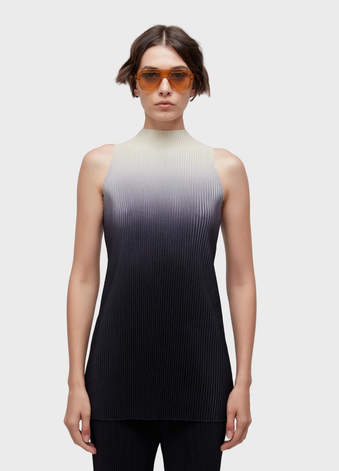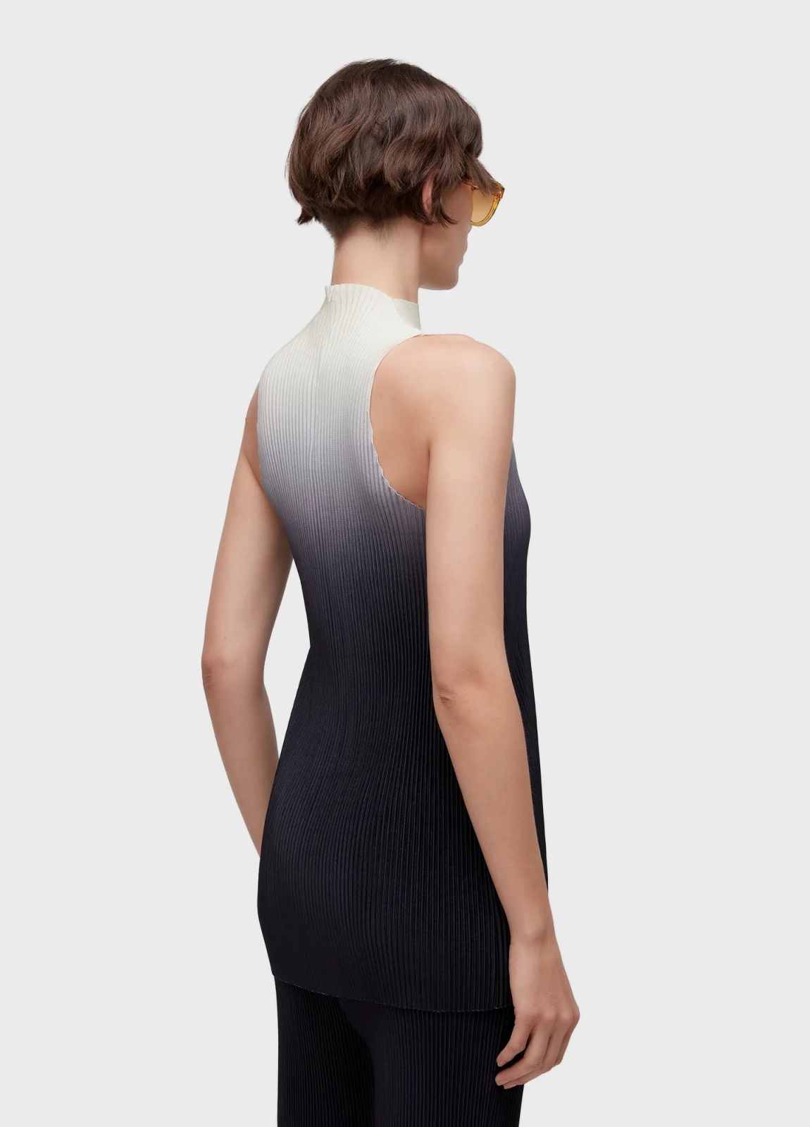 グラデーションプリント、前後ラグランスリーブ、切りっぱなしの裾が特徴的な、女性用ミディアムプリーツブラウス。