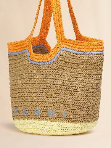 紙ベースのラフィアを手織りした Seaside ホーボーバッグ。 コントラストカラーのベースとトップハンドル。 フロントにナチュラルラフィアのMarniロゴ。 マグネット開閉式。 本アイテムは寸法や模様においてばらつきがありますが、これは職人の手によるものであることの証です。