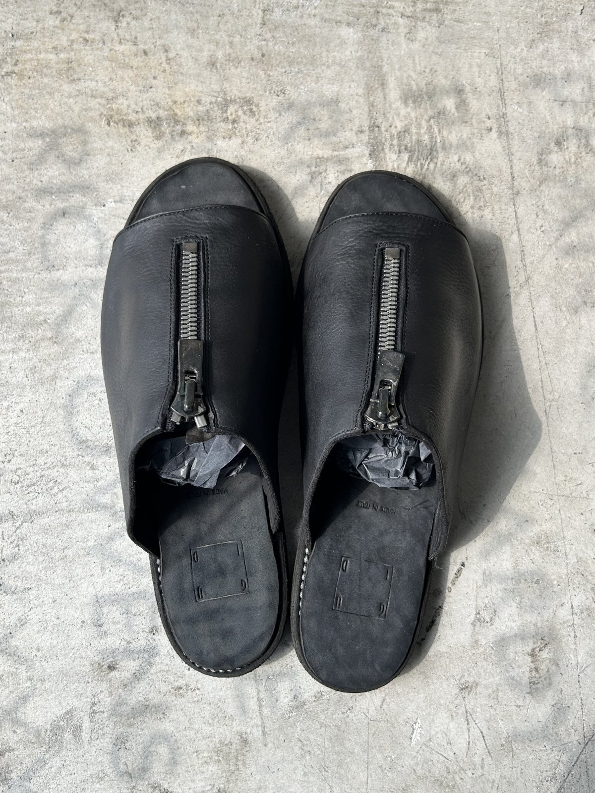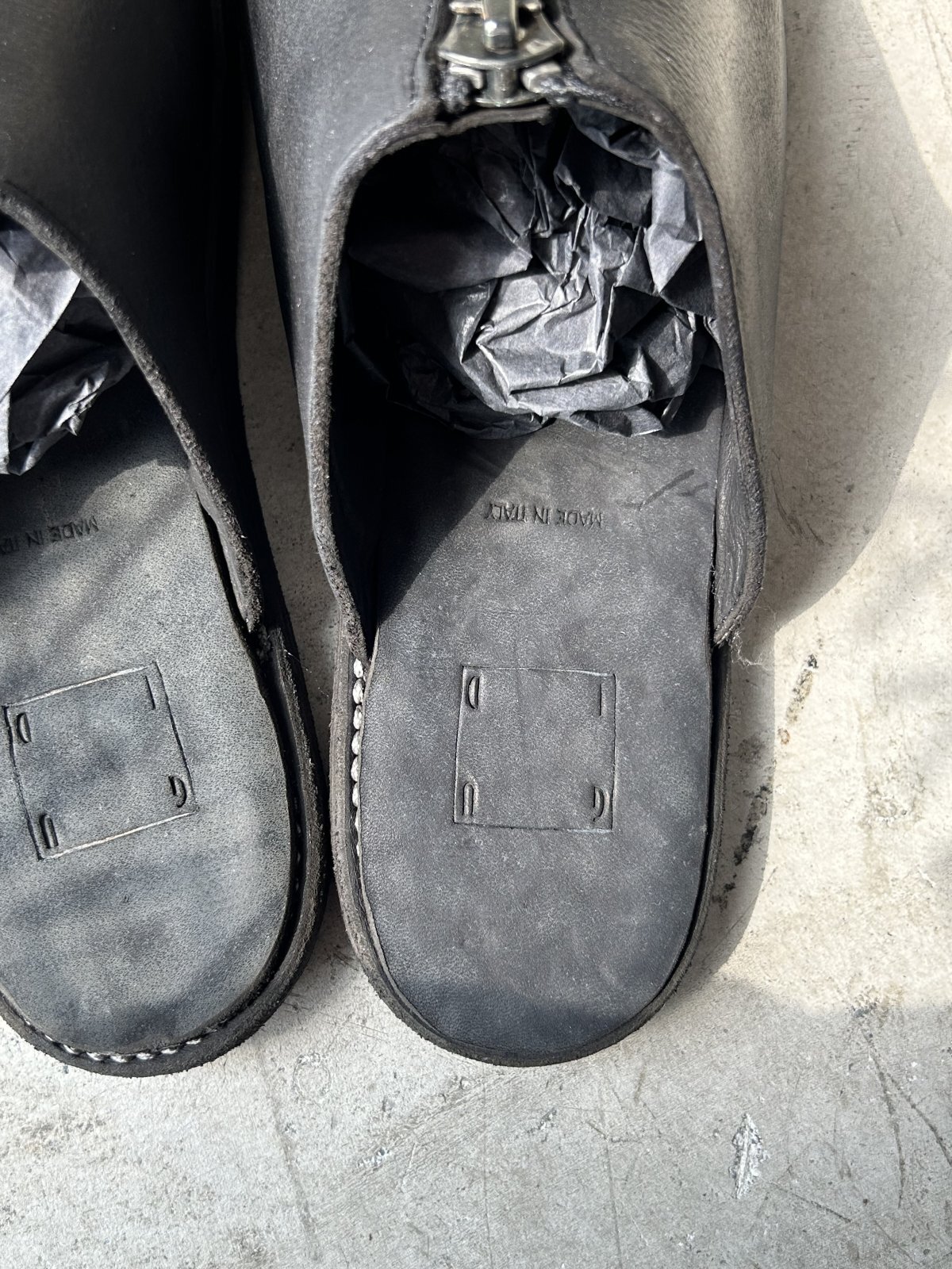 製品として形成した後に染めるタンブラーダイが特徴の一つ。ジップやレザーソールも染まることで全体に独特な風合いが生まれる。