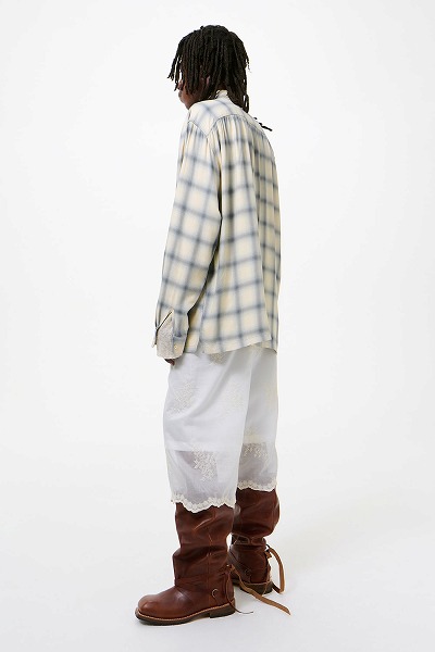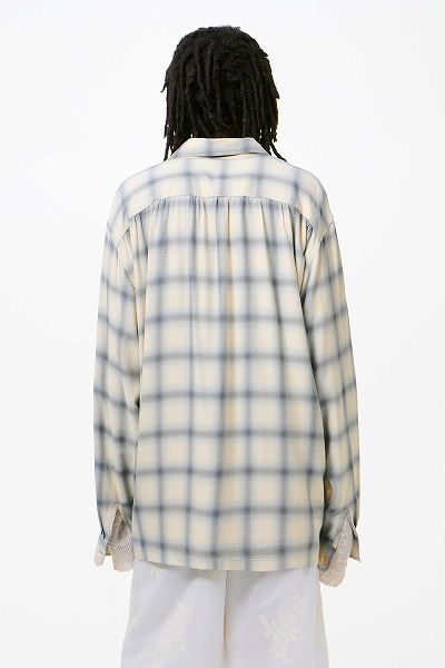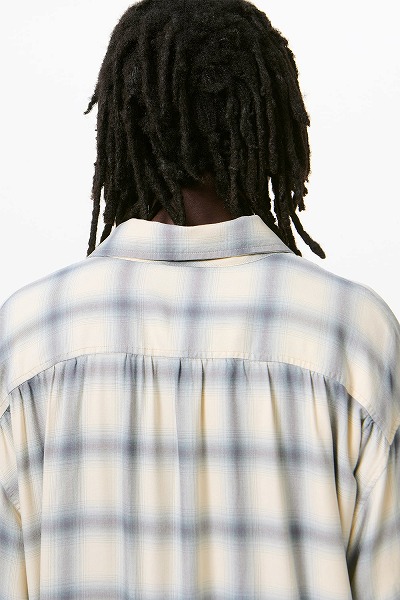 サクラメント・カウボーイ・ビスコースを使用した、当社のエブリシャツ。日本製ビスコース生地を使用したメンズエブリシャツは、ゆったりとしたフィット感で、チェック柄、ストレートヘム、幅広の裏地が付いたすっきりとした前立て、マザーオブパールボタン、そしてさりげないギャザーを寄せたバックヨークが特徴です。