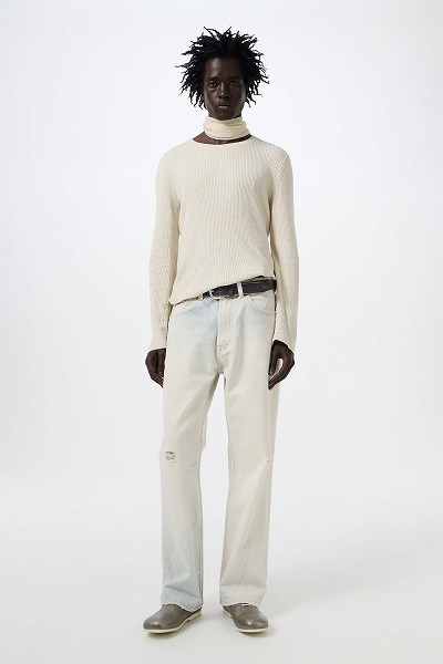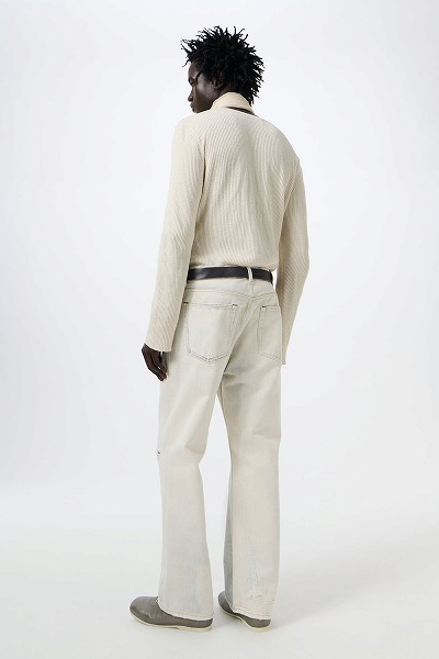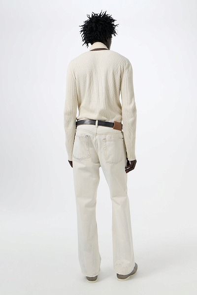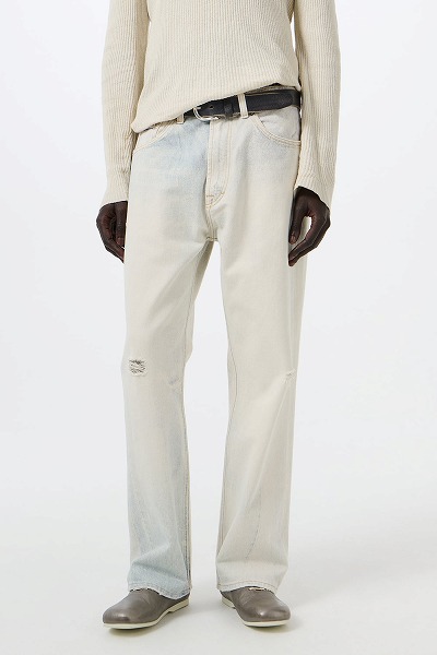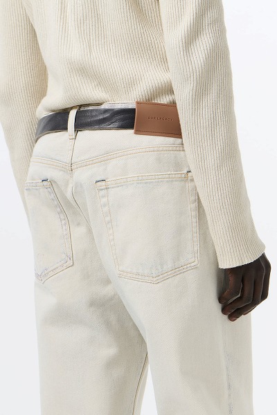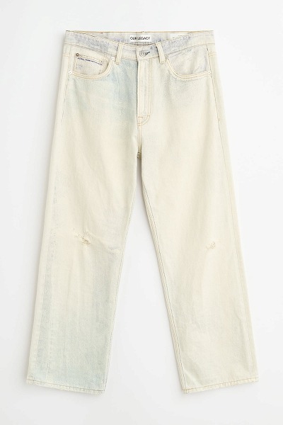 デジタルコーヒープリントのサードカット。イタリア製デニムを使用し、トロンプルイユのヴィンテージデニムプリントを施したメンズサードカットは、ゆったりとしたフィット感とワイドストレートレッグが特徴で、ダメージ加工、YKKジップフライ、メタルリベット、補強されたバックポケットを含む5つのポケット、そしてOUR LEGACYのエンボス加工パッチがあしらわれています。