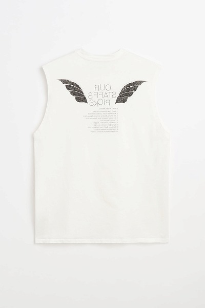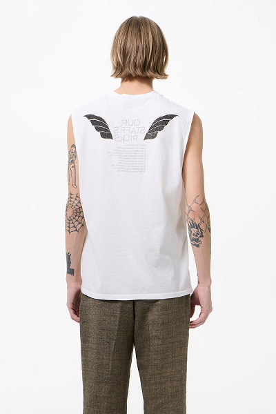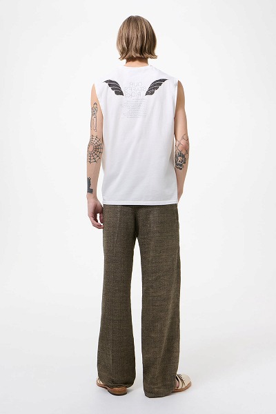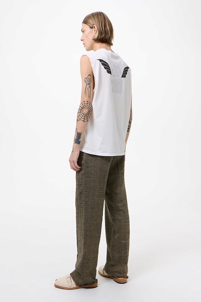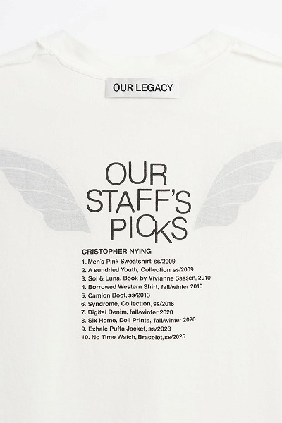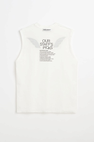スタッフのおすすめプリントを施した「ブリーズタンクトップ」。ポルトガル産のコットン生地を使用したこのノースリーブタンクトップは、ゆったりとしたボックスシルエットで、オーバーロック仕上げのネックカフとストレートヘムが特徴です。背面にはグラフィックプリントが施され、外側には翼の模様、内側にはテキストがプリントされており、内側からのみ読むことができます。テキストには、クリストファー・ナイイングが長年愛用してきたOur Legacyのアイテムがリストされています。